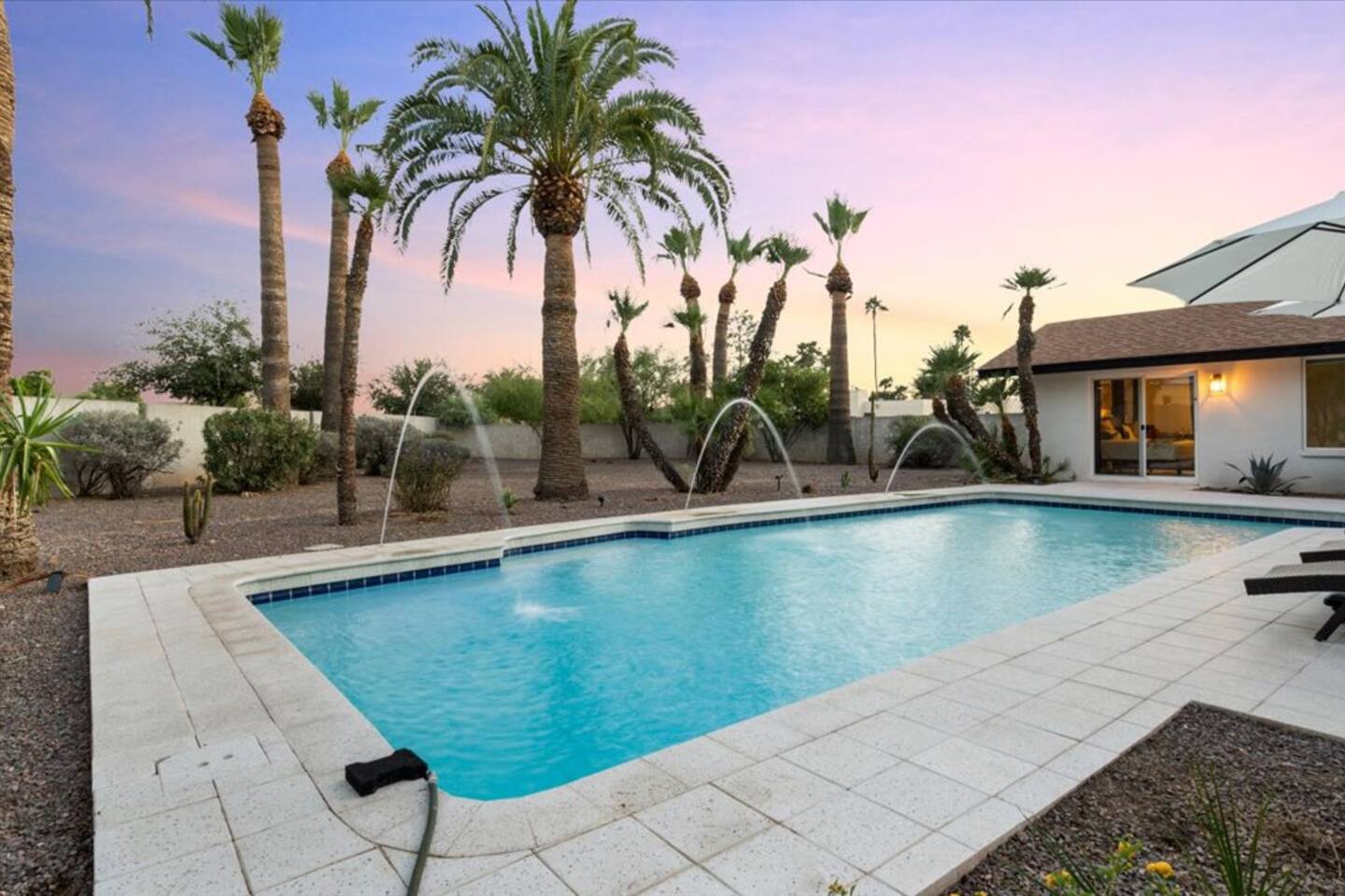 Huge property in Old Litchfield Park close to Wigwam Resort. Amazing Pool!! Oversized gourmet kitchen with top of the line appliances, gas stove 3 king bedrooms with TV's in each room. 1 additional bedroom with 2 queen beds, big screen tv and en suite bath. 3.5 bathrooms total. All rooms have access doors to pool. Lounge room featuring additional tv area, high top game table and French doors leading to front patio Large covered patio with sofa lounger, firepit and dining table Outdoor grill Huge pool with 4 lounge chairs and 2 umbrellas $75 per day charge to heat the pool to max of 85 degrees during winter Cornhole, ping pong and 4 beach cruisers (damage deposit and separate waiver must be signed) Oversized laundry room Culdesac lot Longer stays (28+days) please contact before booking. Different rules apply as well as different security deposit, agreement and cleaning requirements.